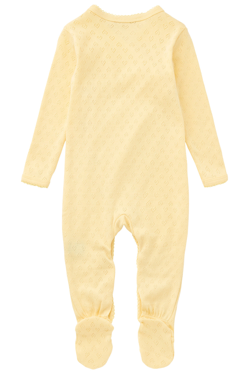 Pointelle heldragt lavet i økologisk bomuld.Designet med lange ærmer og slå om effekt foran, for en lettere skiftning. Den lette pointelle med de fine hjerter er lavet i en super blød jersey kvalitet og kommer i 4 forskellige sommerfarver; Creme, Lys rosa, en frisk lysegul og en klassik mørkeblå. Vask dem igen og igen på 40 grader og de vil holde formen stadig. Ingen fnug og farverne vil ikke falme.