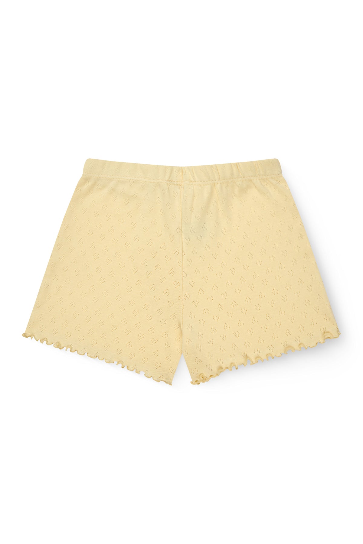 Pointelle shorts lavet i økologisk bomuld. Designet med elastik i taljen for ekstra komfort og en lille babylock kant, som giver et sødt sommerlook. Den lette pointelle med de fine hjerter er lavet i en super blød jersey kvalitet og kommer i 4 forskellige sommerfarver; Creme, Lys rosa, en frisk lysegul og en klassik mørkeblå. Vask dem igen og igen på 40 grader og de vil holde formen stadig. Ingen fnug og farverne vil ikke falme.